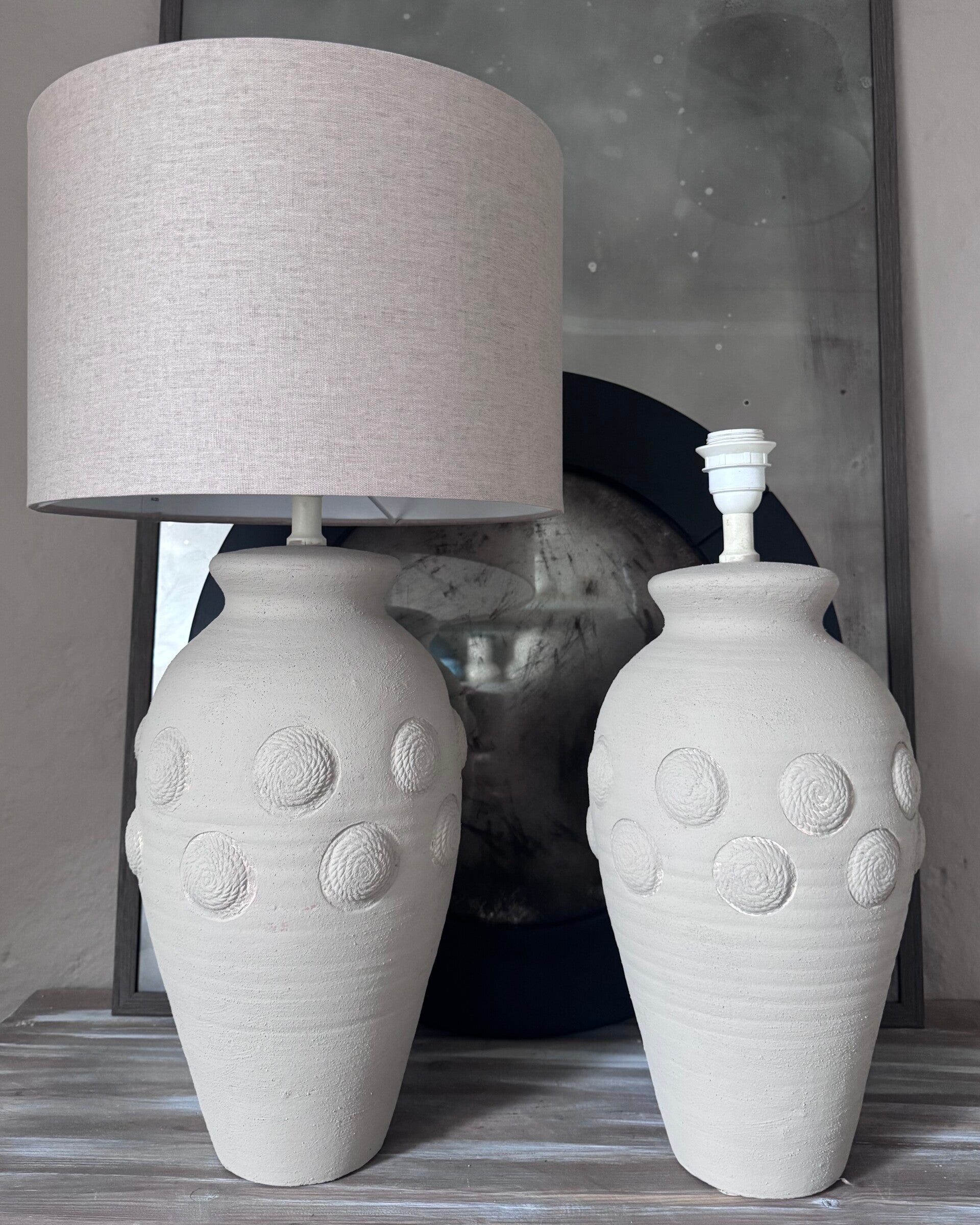 Erfalik lamper er en stor tungflot lampe, hvor materialet er terracotta. Den er overflade behandlet til et rustikt udtryk.